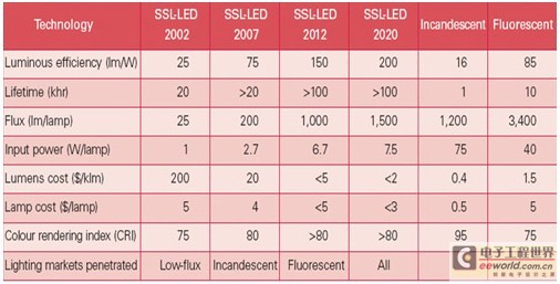 雖然在2003年時,LED亮度效能未能達到主照明的需求(表1),但已逐漸讓世界注意到LED的未來性及對傳統(tǒng)光源的威脅性。